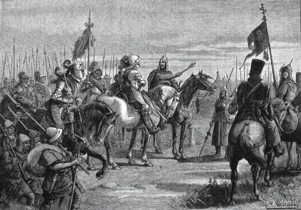 16 (26) октября 1604 года Лжедмитрий с отрядом из 2 тысяч наёмников и 2 тысяч запорожских и донских казаков вторгся на территорию Северской земли. Через пять дней самозванцу присягнули жители первого города — Моровска. К Лжедмитрию присоединялись местные служилые люди по прибору, служилые люди по отечеству, а также пришлое казачество. Первые были, в частности, недовольны тем, что царь Борис обязал их пахать государеву пашню, чтобы обеспечить продовольствием гарнизоны передовых крепостей. Вторые рассчитывали получить налоговые льготы и равные права с другими провинциальными дворянскими корпорациями[47]. Третьи стремились к военной добыче, а также были настроены против царя Бориса, который ввёл жёсткие ограничения на торговлю с казачеством[48][34].