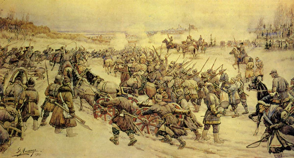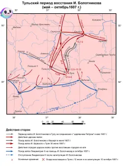 В Северской земле, жители которой не хотели лишиться только что полученных привилегий и налоговых льгот, летом 1606 года началось восстание И. И. Болотникова — бывшего боевого холопа князя А. А. Телятевского. И. И. Болотников называл себя «большим воеводой» царя Дмитрия[75]. Волнения быстро распространились на все южные окраины Русского царства. В ответ на антидворянские прокламации И. И. Болотникова к восстанию присоединилось множество крестьян. Тем не менее главной боевой силой оставались служилые люди и дети боярские южных уездов. На Верхней Оке восставших возглавил веневский сотник Ф. И. Пашков. На стороне И. И. Болотникова выступило рязанское ополчение под руководством местного помещика П. П. Ляпунова. К осени 1606 года на сторону И. И. Болотникова перешли многие города Смоленской и Тверской земли. Беспорядками были охвачены восточные окраины страны[77].