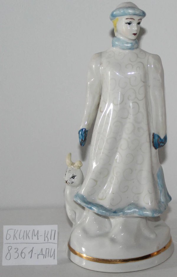 Статуэтка изображает в полный рост сказочную героиню Снегурочку. Справа от неё расположена фигура зайца. На донной части оттиск клейма: в центре две буквы «БЗ», а сверху полукругом надпись «БАРАНIВКА». Статуэтка выполнена из фарфора. Сохранность объекта оставляет желать лучшего. Зафиксированы утрата ушей у фигуры зайца, наличие трещин на дне и незначительное загрязнение.