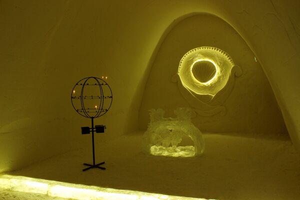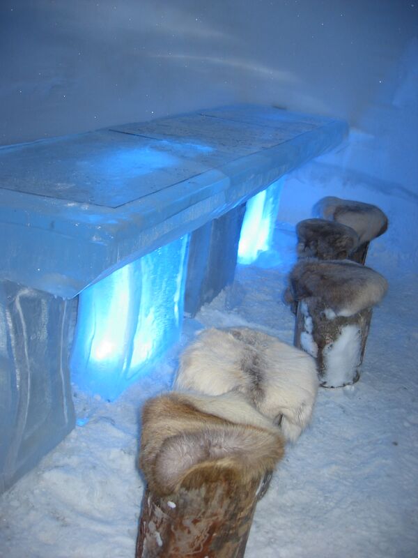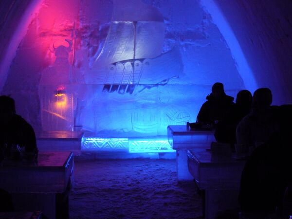- Ресторан имеет ледяные столы и сиденья, покрытые оленьим мехом, а также ледяные скульптуры.