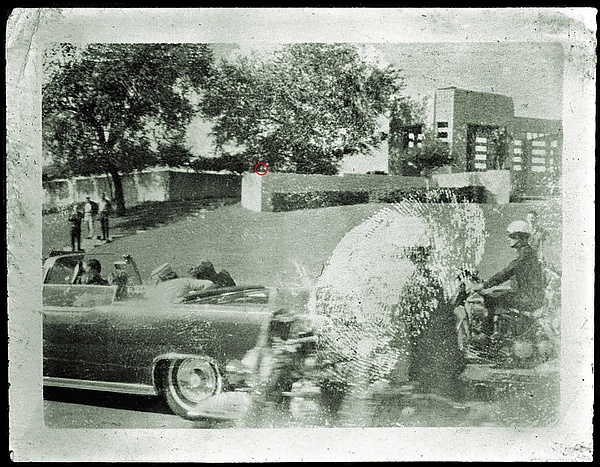 На переднем плане фотографии видна задняя часть президентского автомобиля и два следующих за ним мотоциклиста эскорта. Видно, что Джон Кеннеди заваливается влево, Жаклин Кеннеди поддерживает его. На заднем плане — западный склон травяного холма, часть колоннады, ступени лестницы, ведущей от колоннады к проезжей части, и деревянная изгородь за колоннадой. На парапете колоннады, в правом верхнем углу снимка, видны фигуры А. Запрудера и его секретарши М. Сицман.