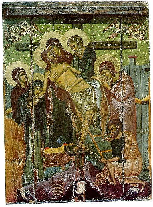 Рассказ о снятии тела Иисуса Христа с креста приводится у всех четырёх евангелистов и каждый из них связывает это событие с именем Иосифа Аримафейского, тайного ученика Христа. В Евангелиях не описано, как происходило само снятие тела, рассказывается лишь о том, как Понтий Пилат дал на это разрешение.