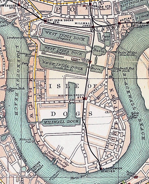 Представляет собой полуостров, который с востока, юга и запада окружён Темзой. На территории Собачьего острова расположены бывшие верфи Лондонского порта. Проложенный в 1899—1902 годах под Темзой пешеходный туннель связывает Собачий остров с Гринвичем.