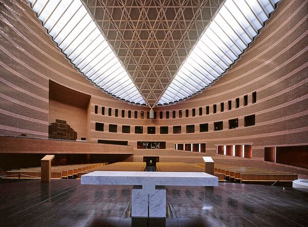 Архитектурное решение собора весьма оригинально: он представляет собой скошенный цилиндр 35 м в высоту и 37 м в диаметре. Для внешней облицовки конструкции было использовано 840 000 кирпичей, привезённых из Тулузы[8]. Выбор материала глубоко символичен: по замыслу архитектора, кирпич — один из самых древних строительных материалов — должен связывать историю и современность. Кирпичи укладывались особым образом, позволяющим избежать эха, которое иначе возникло бы в здании цилиндрической формы, и обеспечить храму прекрасную акустику.