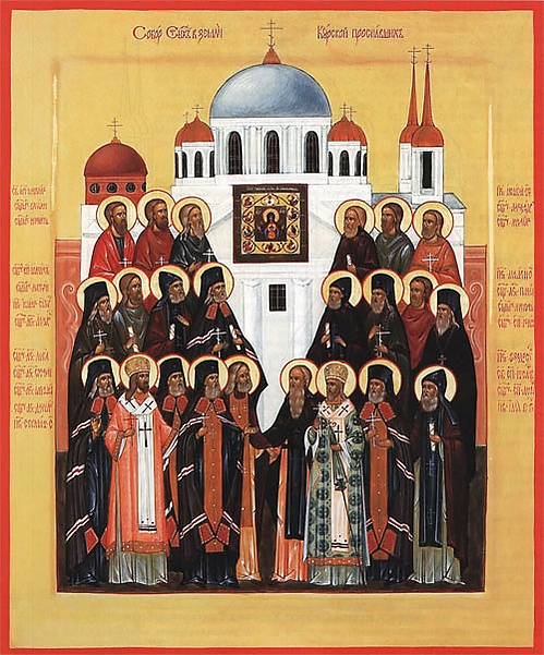 Святителие Христови, Курские архипастыри Онуфрие и Дамиане, на ниве Православия потрудившиеся и кончину мученическую приявшии, многих ко Христу приведшии, и великий старче Серафиме, солнцу равно возсиявший подвигами древних подвижников благочестия в пустыне Саровстей и всю Землю Российскую озаривший блистанием святости подобне Моисею пророку, и преподобне Исаакие, земли Курския отрасле, много потрудившийся в подвигах иночества в обители Оптиной, и вси святии угодницы земли Курския, присные ходатаи пред Господем, добре земное поприще прошедшии, иго Христово понесшии и высоких добродетелей достигшие, нравам благим ближних научившие и заповеди Христови соблюдшие, смиренно ныне мы преклоняемся пред вашим предстательством у Господа. С великим упованием молим вас: не презрите молений наших, но испросисте у Господа милости и щедрот, грешником спасение, сущим в скорбех и печалех утешение, маловерным надежду и терпение, в радости живущим благодарение, болящим исцеление. Присно будете наши молитвенницы и ходатаи пред Господем, дабы и нам грешным соделатися причастниками жизни вечныя в тихих и блаженных обителех Его и наслаждатися лицезрением небесной славы Его и вечно славити и воспевати пресвятое имя Отца и Сына и Святаго Духа во веки, аминь[5].