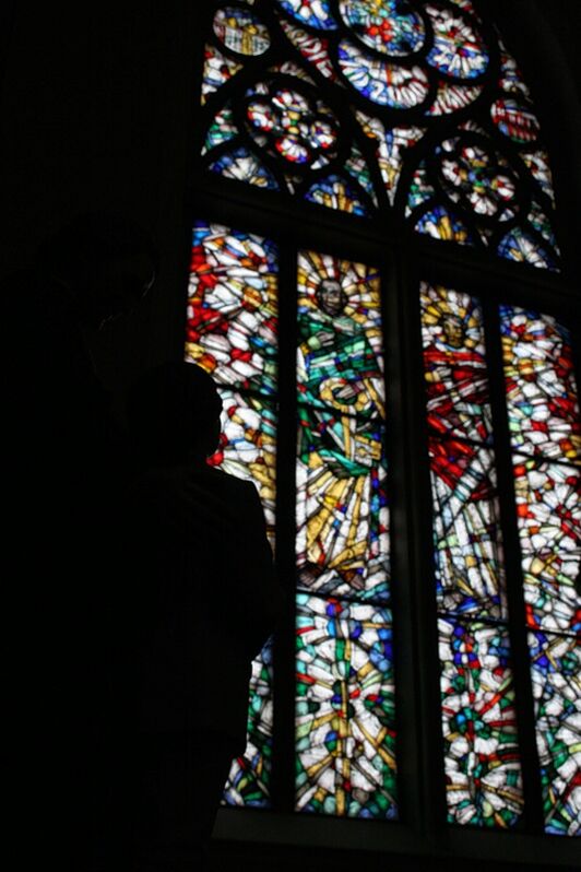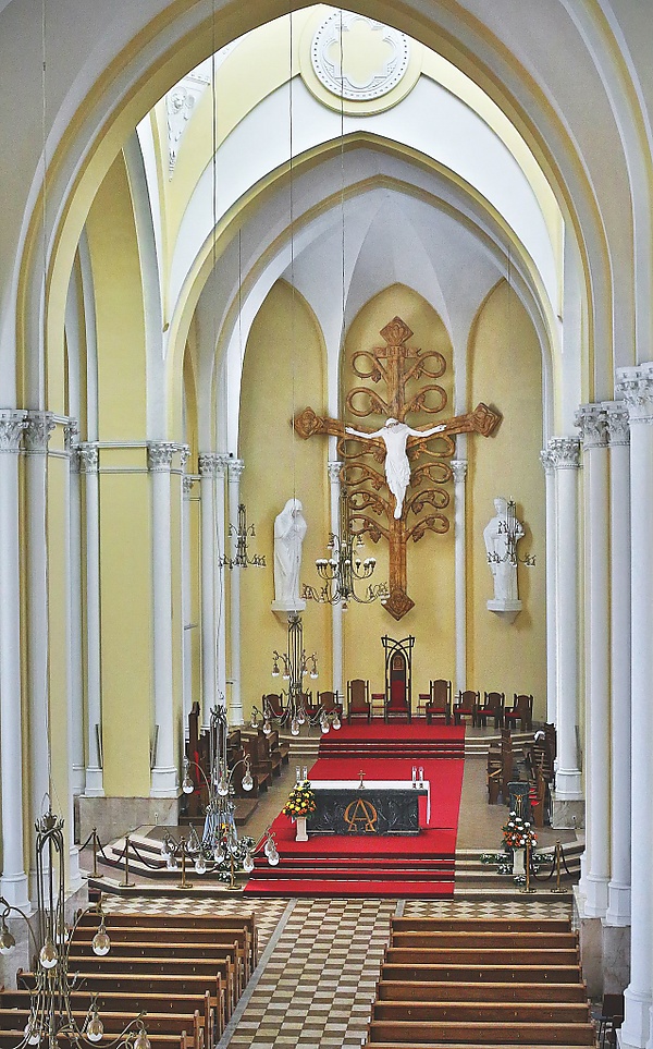 Стрельчатые оконные проёмы украшены витражами. Под ними, на внутренних поверхностях стен, расположены четырнадцать барельефов, символизирующих стояния Крестного пути Иисуса Христа. За первой стрельчатой аркой потолка, между первой парой полуколонн, над помещением нартекса находятся хоры, располагающиеся в задней части нефа[19][4].