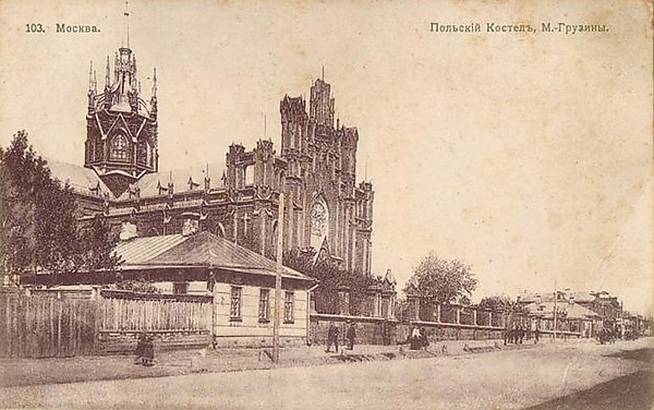 Участок для строительства был приобретён на Малой Грузинской улице, поскольку в этом районе проживало большое число католиков польской национальности, работавших на Московско-Смоленской железной дороге. Строительство храма обошлось в 300 тысяч рублей золотом: деньги на работы были собраны на пожертвования польской общины и верующих из разных городов России. Собор возводили десять лет с 1901 года, последней сделали ограду в 1911 году под руководством зодчего Леона Даукша, а внутреннюю отделку закончили в 1917 году. По периферии участка построили одноэтажные и двухэтажные деревянные дома для служащих храма — два по Малой Грузинской улице, два по Курбатовскому переулку[5]. Храм освятили 21 декабря 1911 года во имя Непорочного зачатия Пресвятой Девы Марии. Храм сохранял статус филиального при приходе святых Петра и Павла до 1919 года, а затем обрёл самостоятельность[3][4][6][7].