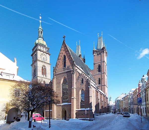 Согласно традиционной версии, храм был заложен в 1307 году вдовой чешского короля Вацлава II Элишкой Рыксой[1], однако новейшие исследования показали, что приходской костёл на месте нынешнего собора начали возводить уже с середины XIII века. Этот костёл был уничтожен пожаром в 1339 году, после чего началось его поэтапное восстановление. В 1339—1342 годах был воздвигнут нынешний пресбитерий и две башни, а строительство трехнефной части храма и ризницы было закончено в 60-х годах XIV века.