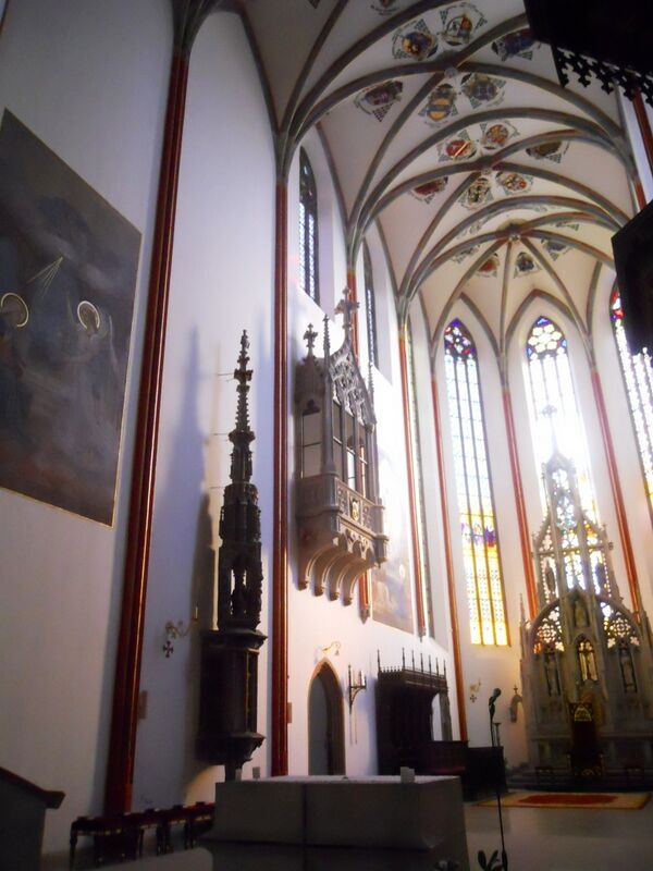 В 1407 году костёл вновь пострадал от пожара. Восстановительные работы затянулись из-за гуситских войн и закончились лишь в 1463 году. В это время храм приобрел вид псевдобазилики. В 1424 году в храме Святого Духа был погребён чешский полководец и национальный герой Ян Жижка. После гуситских войн собору потребовалось восстановление, которое было завершено в 1463 году. Новый пожар, случившийся в 1484 году, существенно повредил башни храма, которые при ремонте были надстроены в высоту и получили новые колокола (старые расплавились при пожаре). Колокола эти сохранились до наших дней и даже имеют имена: колокола на северной башне называются Орел (или Михаэль) и Доминик (или Леопольд), а колокола на южной башне — Жебрак и Клемент. Старейший из четырёх колоколов собора, называемый Леопольд (или Доминик) датируется 1485 годом. Величайший из колоколов собора, называемый Михаэль (или Орел), датируется 1496 годом, он весит 3847 кг, в диаметре достигает 176 см, а в высоту 132 см.