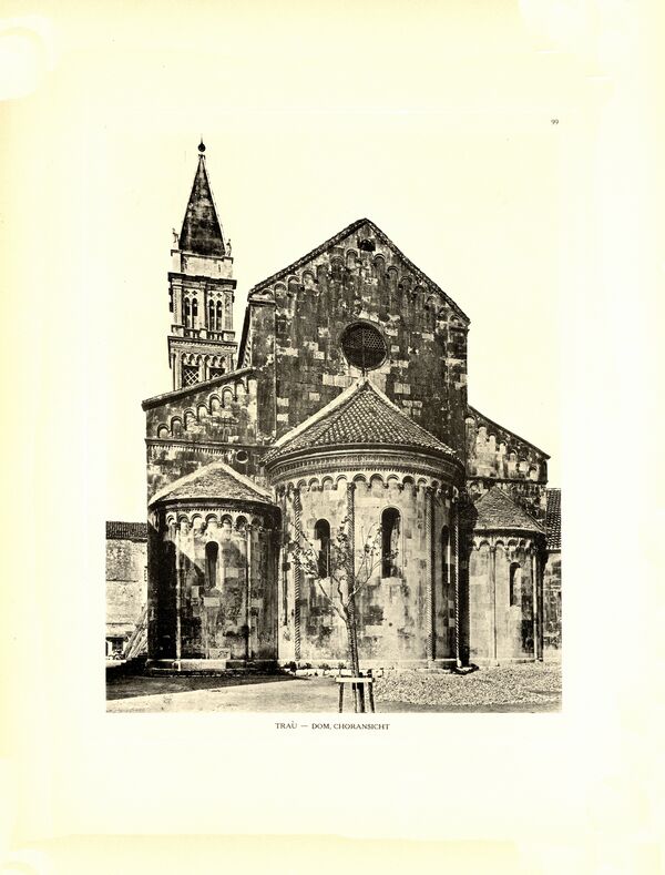 Особенно долго, на протяжении почти трёх с половиной веков продолжалось строительство только одной колокольни, которое было завершено лишь в 1603 году. Построенная в юго-западной части собора и украшенная каменной пластикой колокольня доминирует над всем пространством площади. Стена южного бокового нефа, так же как и среднего, поднятого, а также портик украшены сдержанным романским декором, простыми пилястрами, между которыми вставлены узкие окна с полукруглой аркой, а на самом верху расположен ряд слепых аркад. Почти таким же образом декорированы и три полукруглые апсиды, которые также завершаются вереницей слепых аркад, в то время как оконные проёмы разделены между собой спиральными колоннами романского стиля. В центре южного бокового фасада открывается романский портал, возвышающийся над уровнем площади рядами полукруглых лестниц. Латинская надпись на портале свидетельствует о том, что строительство его было завершено в 1213 году, во времена епископа Трегуна, бывшего родом из Тосканы. Плиты стен хорошо вырезаны, все архитектонические членения и украшения выполнены с высоким чувством меры и мастерством каменщиков.