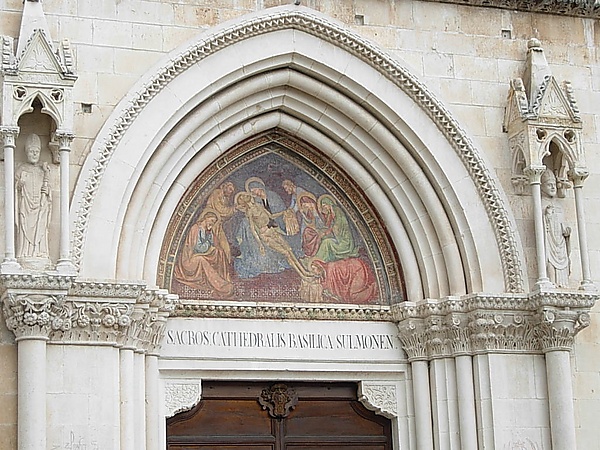 Доступ в сакрестию (ризницу) осуществляется через малый боковой портал XVII века, между порталом с левой стороны, украшенным красивой вязью в ломбардском стиле, и фрагментом римской плиты находятся три апсиды с антропоморфными мотивами в романском стиле. В центре всей этой картины полустишие поэта Овидия: «Sulmo mihi patria est» («Сульмона – моя отчизна»).
