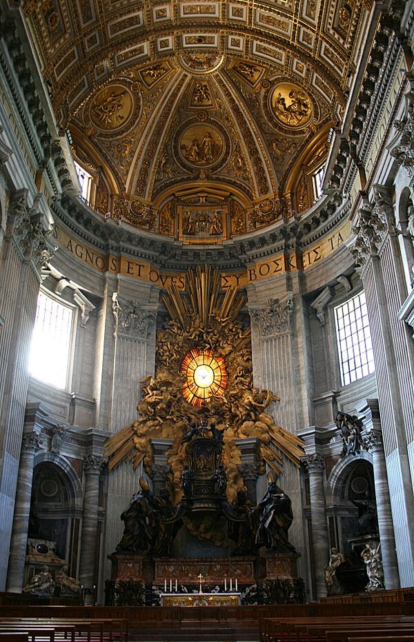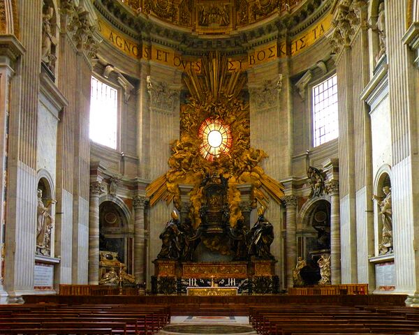 Сквозь гигантский киворий видна находящаяся в центральной апсиде «Кафедра Святого Петра» — монументальная скульптурная композиция, созданная Дж. Л. Бернини в 1657—1666 годах. Центральной частью кафедры служит бронзовый трон с ажурной спинкой, украшенной барельефом «Христос вручает ключи апостолу Петру». Внутри находится деревянное сиденье от епископского кресла, которое, по преданию, использовал сам апостол Пётр. Трон окружён фигурами ангелов и поддерживается статуями четырёх великих Учителей Церкви. Двое западных, Амвросий Медиоланский и Аврелий Августин, находятся с внешней стороны кафедры и изображены в западных митрах; двое восточных, Иоанн Златоуст и Афанасий Великий, находятся с внутренней стороны трона и изображены с непокрытыми головами[16].