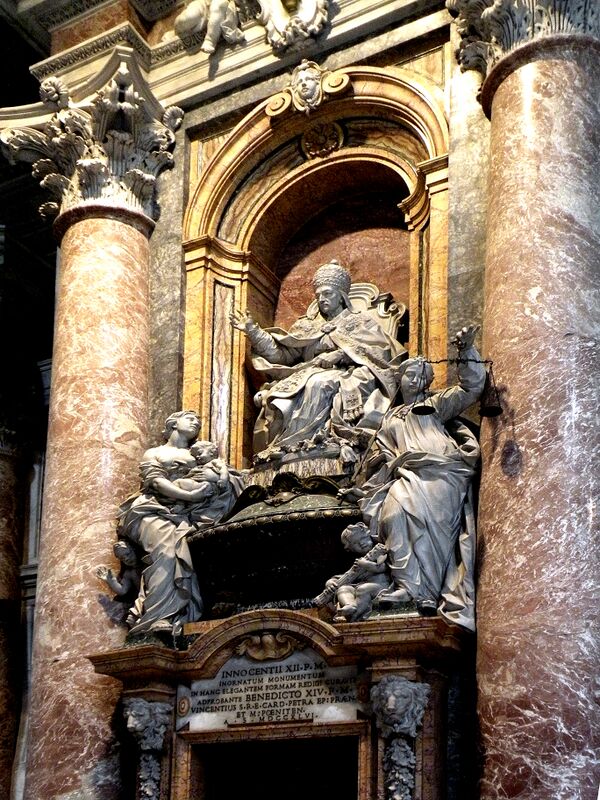 Надгробие Александра VII работы Бернини. Огромный интерес представляет созданное в 1490-х годах скульптором Антонио Поллайоло надгробие Иннокентия VIII, это один из немногих сохранившихся памятников, находившихся ещё в старой базилике. Недалеко от входа находится ещё одно создание скульптора Кановы — надгробие последних представителей шотландской королевской семьи Стюарт.