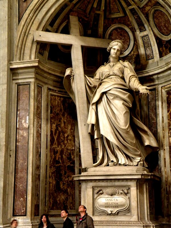 Средокрестие соответствует плану Микеланджело, сохранившего идею греческого креста Браманте. Купол собора диаметром 42,5 метра посредством подпружных полуциркульных арок опирается на четыре мощных пилона, оформленных пилястрами с коринфскими капителями. В парусах помещены круглые медальоны восьми метров в диаметре с мозаичными изображениями четырёх евангелистов. В 1629—1635 годах эта композиция была дополнена четырьмя пятиметровыми статуями в нишах опорных пилонов. Статуи святых Елены, Вероники, Лонгина Сотника и Андрея соответствуют реликвиям (фрагмент Креста Господня, часть плата Вероники, фрагмент копья Лонгина, глава апостола Андрея), положенным в капеллах над нишами, в которых расположены эти статуи. В настоящее время эти реликвии больше не находятся на их первоначальном месте, но три реликвии Страстей Господних находятся в капелле над статуей святой Вероники и демонстрируются в пятое воскресенье Великого поста[15].