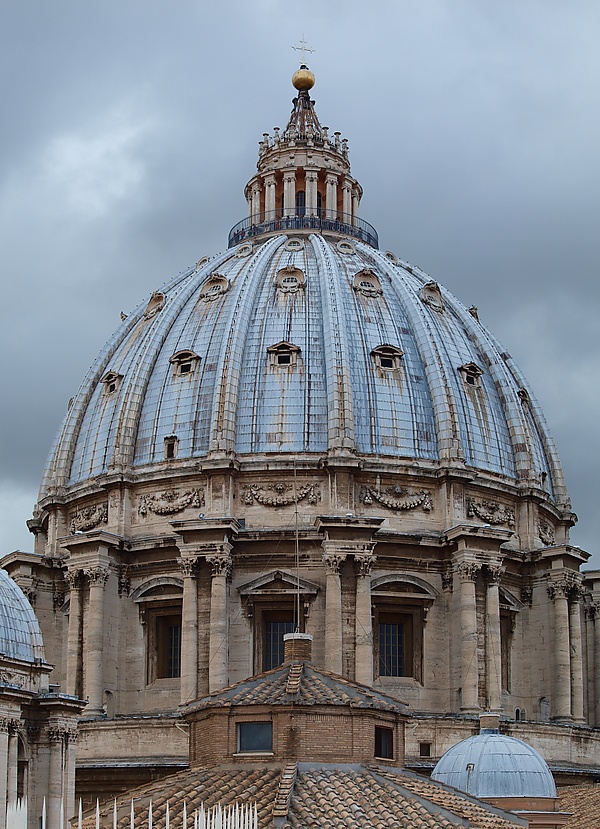 Высота купола 138 м. Овоидальная форма купола вызывала много пересудов. Микеланджело умер в 1564 году, успев закончить барабан купола и столбы Браманте, которые были выполнены намного более крупными, чем планировалось. Работу продолжил ассистент Микеланджело Джакомо да Виньола под строгим присмотром Джорджо Вазари, который по приказу папы следил за тем, чтобы замыслы Микеланджело были воплощены без отступлений. Но уже в 1585 году новый папа Сикст V назначает ответственными за постройку Джакомо Делла Порту и Доменико Фонтану. За время правления папы строительство собора продвинулось очень значительно.
