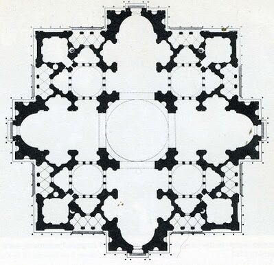 После смерти Браманте строительство в 1514—1520 годах возглавлял Рафаэль Санти, вернувшийся к традиционной форме плана базилики в виде латинского креста, затем Бальдассаре Перуцци, остановившийся на центрическом сооружении, и Антонио да Сангалло, избравший базиликальную форму. Наконец в 1546 году руководство работами было поручено Микеланджело Буонарроти. Он вернулся к идее центрического крестово-купольного сооружения, но его проект предусматривал создание многоколонного входного портика с восточной стороны (в древнейших базиликах Рима, как и в античных храмах, вход находился с восточной, а не с западной стороны).
