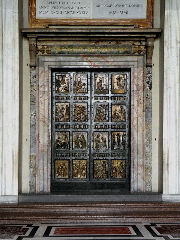Пять порталов (дверей) ведут из портика в неф собора. Крайняя дверь слева именуется «Вратами смерти». Рельефы этой двери созданы в 1961—1964 годах итальянским скульптором Джакомо Манцу[7]. Следующая дверь: «Дверь добра и зла», выполненная Лучано Мингуцци с 1970 по 1977 год[8].