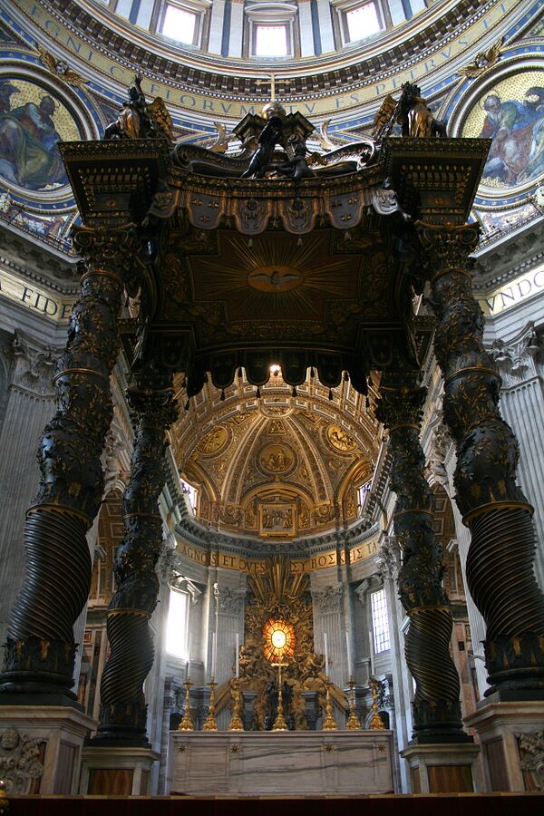В подкупольном пространстве над главным алтарём находится шедевр Бернини — огромный, высотой 29 метров киворий, опирающийся на четыре витые колонны, на вершинах которых установлены скульптуры ангелов. Человек среднего роста не достигает даже высоты постаментов бронзовых колонн. Среди ветвей лавра на верхних частях колонн видны геральдические пчёлы семейства Барберини, к которому принадлежал Папа Урбан VIII, по чьему распоряжению создавали это необычное произведение. Бронзу для кивория взяли из Пантеона, разобрав по приказу папы (Барберини) кровлю пронаоса. Оформление алтаря и спуска в крипту к гробнице апостола создал К. Мадерна.