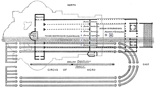 Когда-то вблизи места, где теперь высится собор Святого Апостола Петра, располагались сады цирка императора Нерона. Об этом напоминает египетский обелиск из Гелиополя, который в 1586 году перевёз из цирка и установил в центре площади Святого Петра перед собором архитектор Доменико Фонтана.