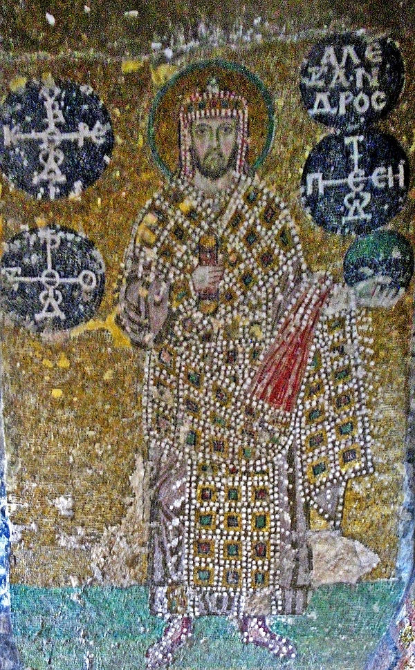 На северо-западном столбе северной верхней галереи собора находится мозаичный портрет императора Александра. Он был открыт в ходе реставрационных работ 1957—1960 годов и имеет точную датировку 912 годом[86]. Мозаика относится к типу вотивных изображений и является прижизненным портретом императора.