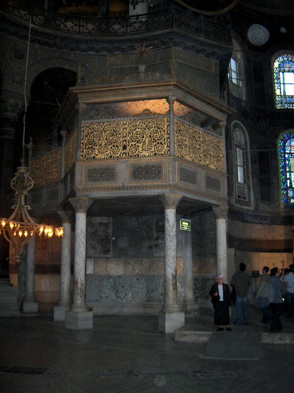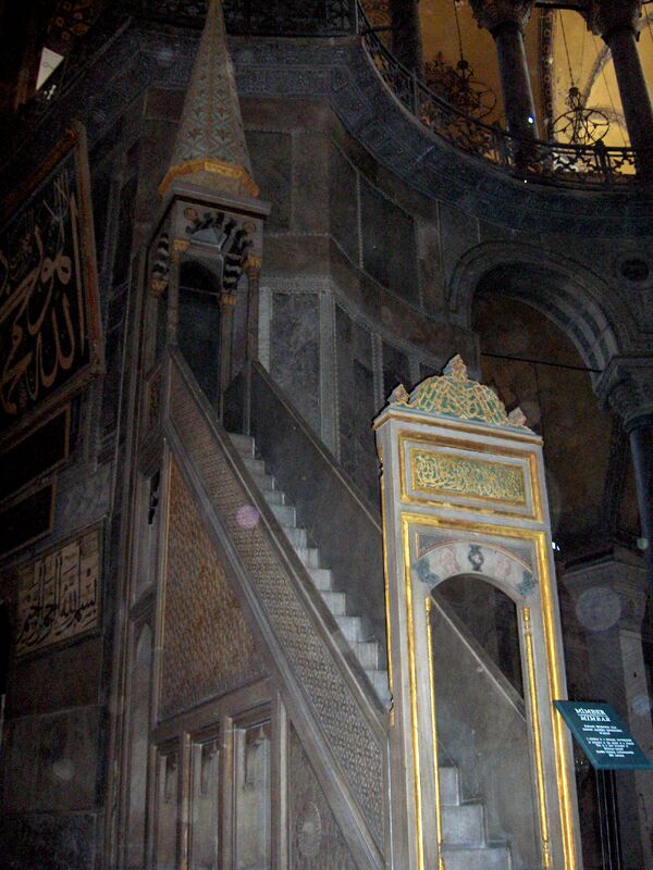 Мраморный резной минбар был построен в конце XVI века при султане Мураде III[97]:59. При султане Махмуде I в 1739—1742 годах была проведена перестройка собора, в ходе которой в алтарной части появился михраб[98]:28. Современный михраб относится к XIX веку и был отреставрирован архитектором Густавом Фоссати в 1847—1849 годах[97]:58. По обеим сторонам михраба установлены бронзовые подсвечники, привезённые в 1526 году султаном Сулейманом Великолепным из Буды[98]:29.