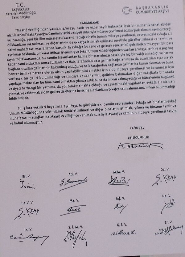 10 июля 2020 года Госсовет Турции отменил решение 1934 года о превращении собора Святой Софии в музей и постановил, что это здание может использоваться в качестве мечети[58]. В этот же день президент Турции Тайип Эрдоган подписал указ о превращении Айи-Софии в мечеть[4][59]. Данное решение вызвало официальную критику со стороны ЮНЕСКО[60], Всемирного совета церквей, Европейского союза, Австрии, Германии, Греции, Кипра, США, Константинопольской, Иерусалимской, Русской, Элладской православных церквей, а также Православной церкви Украины, Евангелической церкви Германии и Святого Престола[61][62][63][64][65][66]. Всемирный совет церквей призвал Эрдогана пересмотреть решение по Святой Софии[67].