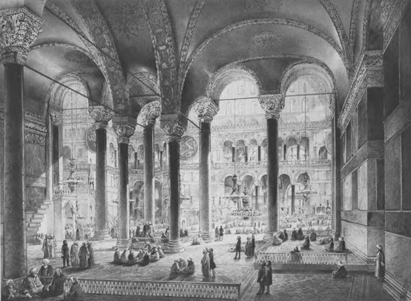 Подкупольное пространство с северной и южной сторон сообщается с боковыми нефами с помощью арок, поддерживаемых порфировыми и малахитовыми колоннами, вывезенными из храмов Малой Азии и Египта[73]; под этими арками идёт ещё по ярусу подобных же арок, которыми открываются в подкупольное пространство устроенные в боковых нефах галереи гинекея, а ещё выше — громадные арки, поддерживающие купол, заделаны прямой стеной с окнами, расположенными в три ряда. Кроме этих окон, внутренности храма дают обильное, хотя и несколько рассеянное освещение 40 окон, опоясывающих основание купола, и по пяти окон в больших и малых нишах.