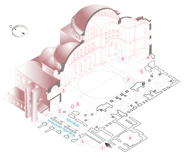 Середина широкого нефа, квадратная в основании, ограничена по углам четырьмя массивными столбами, подпирающими громадные арки, и покрыта довольно плоским куполом 31 м в диаметре, вершина которого отстоит на 51 м от пола[73]. Купол состоит из сорока радиальных арок; в нижних частях межарочных промежутков прорезаны арочные окна (их также 40), благодаря чему в нижней части купола создаётся ощущение сплошного светового пояса[74]. Купол связан с перекрываемым прямоугольным в плане пространством с помощью сферических треугольников — парусов, — которые в дальнейшем получили большое распространение в мировой архитектуре[73]. К подкупольному пространству примыкают с востока и запада две колоссальные ниши с полусферическим верхом: в восточную нишу открываются своими арками ещё три меньшие ниши, из которых средняя, служившая алтарной апсидой, глубже остальных и выступает из общего плана храма в виде полукружия; к западной большой нише примыкают также три ниши; из них средняя, представляющая вверху не полусферический, а обыкновенный коробовый свод, содержит в себе три двери, ведущие в пристроенные к храму внутренний и внешний притворы, впереди которых некогда находился теперь несуществующий двор, обнесённый галереей с колоннами.