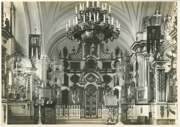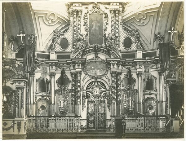 Центральный трёхъярусный иконостас был нежно-голубого цвета с шестнадцатью позолоченными колоннами и позолоченными фигурами десяти ангелов. На позолоченных резных Царских вратах в серебряных ризах находились иконы Благовещения Пресвятой Богородицы и четырёх Евангелистов.