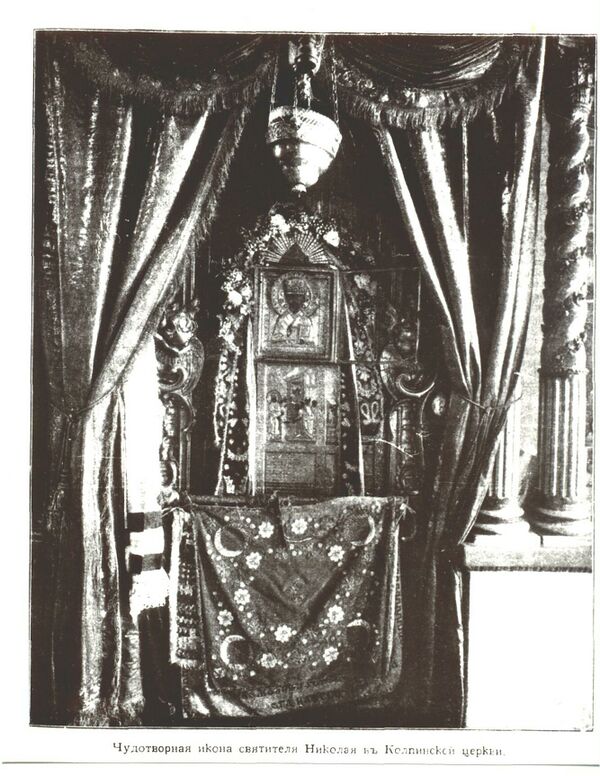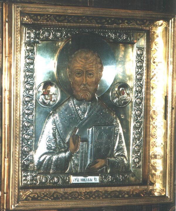 Икона Св. Николая, явившаяся 23 декабря 1713 года рабочему Иакову, который страдал цинготной болезнью, лежал в больнице при старой пильной мельнице. Длина иконы 8 вершков, ширина — 6 вершков. Риза на ней серебряная, 84-й пробы, вызолоченная, весом 1 фунт 49 зол., обложена множеством драгоценных камней…