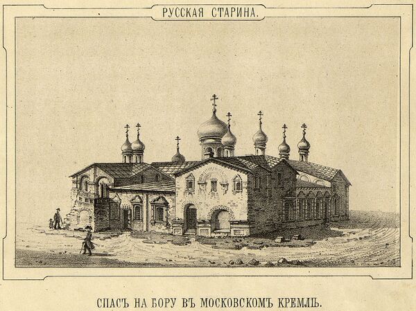Незадолго до наполеоновского нашествия Спас-на-Бору запечатлел на своём рисунке Фёдор Алексеев. Из него следует, что к тому времени основной объём храма был плотно обстроен приделами «иже под колоколы»[15]. В 1812 году французские солдаты осквернили храм: хотя иконостас и уцелел, «с престолов и жертвенников были сорваны одежды, в алтаре навалены кули с овсом, в храме мешки с хлебом, а в трапезе стояли лошади; южный верхний придел обращен был в жилой покой»[17]. В 1850—1860-х годах по проекту архитектора Фёдора Рихтера храм отреставрировали и заново расписали. При этом его постарались по возможности освободить от позднейших архитектурных привнесений.