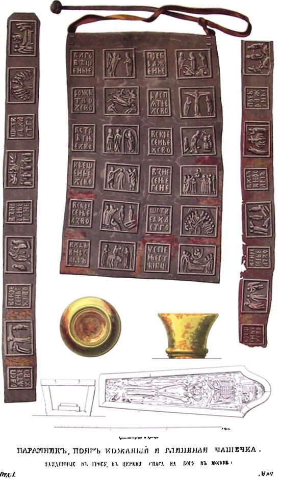 Фёдор Солнцев в «Древностях…» пишет: «…открыты в 1836 г. при переделке стенок под каменным помостом два каменных гроба, покрытых такой же плитой; один у южной, другой у северной стены от входа. В первом найдено ещё не истлевшее тело в широком шелковом платье с широкими рукавами, палевого цвета; голова его, сохранившая кожу и волосы, покрыта шелковым убрусом. В ногах у него лежала берцовая кость и чашечка глиняная, муравленая. В другом гробе открыт полуистлевший остов, судя по краткости бедренных костей и тазовому выгибу позвоночного столба, женский. Кости сохранили своё естественное положение до того, что руки остались сложенными, только голова, отделившаяся от туловища, лежала поодаль, вероятно оттого, что истлело изголовье, на коем она покоилась. На груди у него был кожаный параманд с ремешками; чресла его обнимал такой же пояс. В ногах лежала глиняная чашечка, как и у другого, муравленая, и остатки кожаных сандалий». Он приводит рисунки этих находок.