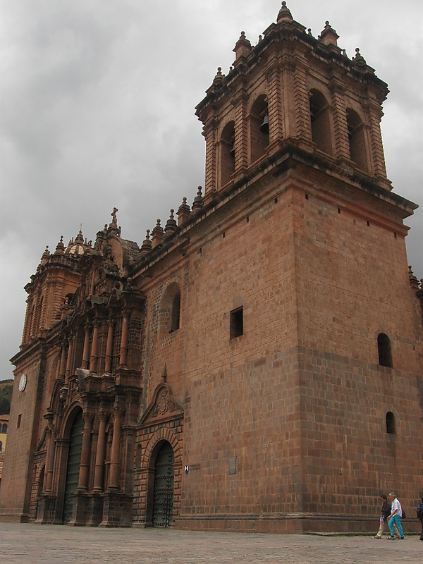 Большую часть камня для строительства собора бралась из Саксайуамана, крепости инков на холме над Куско.[4][5] Но из-за своих огромных размеров Саксайуаман не сильно пострадал от этого изъятия. Как и строительство на фундаменте дворца и храма Виракочи, использование камня из священного для инков Саксайуамана производилось в том числе и для того, чтобы унизить религию инков. Как только испанцы узнали, что песок на главной площади считается священным для инков, они стали его использовать в строительном растворе.[7]