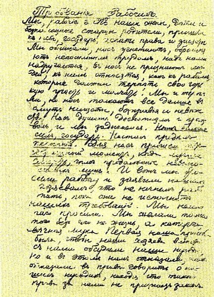 «Вот, государь, наши главные нужды, с которыми мы пришли к тебе… Повели и поклянись исполнить их, и ты сделаешь Россию и счастливой и славной, а имя твое запечатлеешь в сердцах наших и наших потомков на вечные времена. А не повелишь, не отзовешься на нашу мольбу, — мы умрем здесь, на этой площади, перед твоим дворцом. Нам некуда больше идти и незачем. У нас только два пути: или к свободе и счастью, или в могилу…»[11].