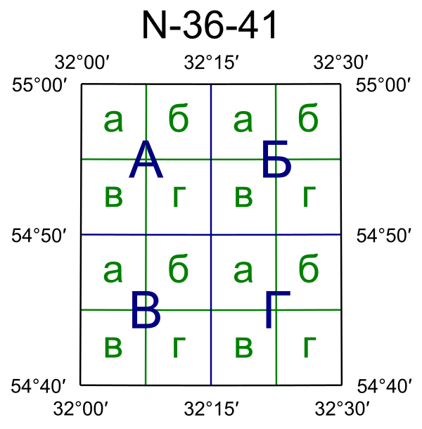Лист карты масштаба 1:10 000 (100 м в 1 см) образуется делением листа карты масштаба 1:25 000 на четыре части; номенклатура его образуется из номенклатуры двадцатипятитысячной карты с добавлением арабской цифры от 1 до 4; например, N-37-56-А-б-1.