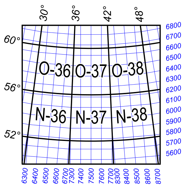 Координата x (подписанная на вертикальных краях листа карты) выражает расстояние до экватора, а координата y (подписанная на горизонтальных краях листа карты) — номер зоны (первые одна или две цифры значения) и положение относительно центрального меридиана зоны (последние три цифры значения). Центральному меридиану зоны присваивается значение 500 км (так как ширина зоны не может превышать 668 км, трёхзначного числа достаточно, чтобы выражать координату y в её пределах). Например, точка с координатами x = 6216 и y = 7350 находится в 6216 км от экватора и в 150 км (500−350=150) к западу от базового меридиана 7-й зоны (39° в. д.).