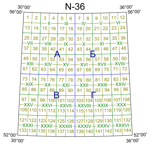 Карты масштаба 1:100 000 (1 км в 1 см) получаются делением листа миллионной карты на 144 части (рис. 3); их номенклатура состоит из обозначения листа карты масштаба 1:1000000 с добавлением одного из чисел 1, 2, 3, 4, …, 143, 144. Например, лист стотысячной карты с г. Рязань будет N-37-56.