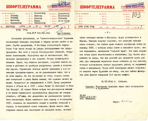 30 апреля 1941 года временный поверенный в делах СССР в Югославии В. З. Лебедев сообщил в Народный комиссариат иностранных дел СССР, что немецкий представитель объявил 23 апреля 1941 года всем иностранным миссиям о том, что дальнейшая их деятельность «признается» незаконной[75]: