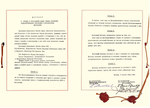 Советско-югославский договор был официально подписан в 10 часов вечера 5 апреля 1941 года в Москве без особого торжества, но в присутствии Иосифа Сталина[68].