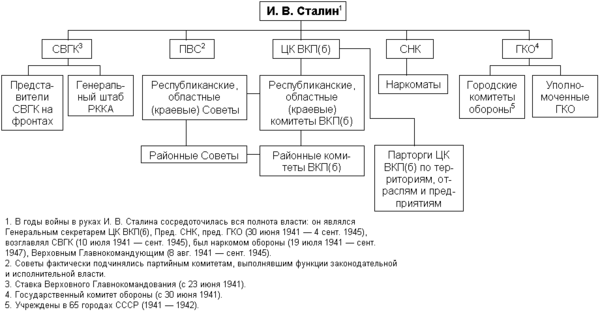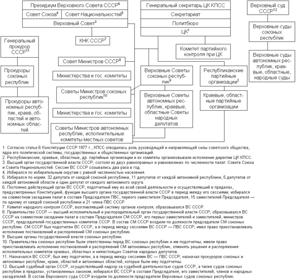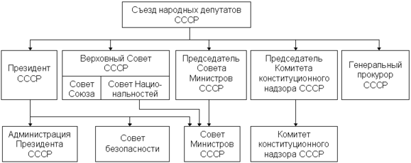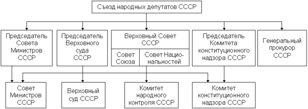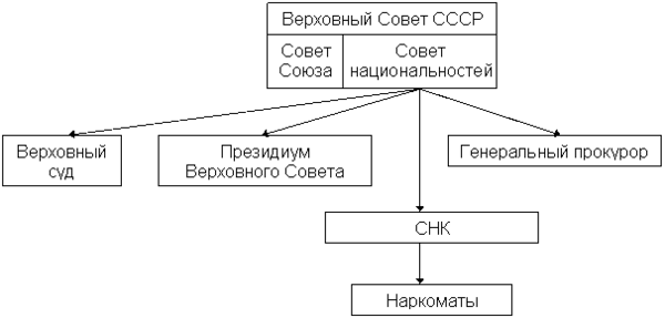Высшим органом государственной власти в СССР являлся Верховный Совет СССР, избиравшийся на 4 года. Он состоял из двух палат: Совета Союза и Совета Национальностей. Совет Союза избирался гражданами СССР по избирательным округам по норме: 1 депутат на 300 тысяч жителей. Совет Национальностей избирался гражданами СССР по норме: 25 депутатов от союзной республики, 11 от автономной республики, 5 от автономной области и 1 от каждого национального округа. Верховный Совет СССР избирал Президиум Верховного Совета СССР — высший орган власти Союза ССР в период между сессиями Верховного Совета. Также Верховный Совет СССР избирал правительство СССР — Совет Народных Комиссаров СССР (после 1946 г. — Совет Министров СССР), высший исполнительный и распорядительный орган.