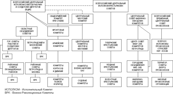 В армии и на флоте Временное правительство опиралось на традиционное командование, Петросовет — на солдатские и матросские комитеты. Власть Государственной думы на местах опиралась на традиционные земства и городские думы, Петросовета — на Советы на местах. Реальная власть Петросовета фактически сосредоточилась в руках его Исполнительного комитета, невыборного органа, поголовно состоявшего из радикальной интеллигенции, представлявшей различные социалистические партии. Историк Ричард Пайпс характеризовал Петросовет как «слоистую структуру»: «сверху — выступающий от имени Совета орган, состоящий из социалистов-интеллигентов, оформленный в Исполнительный комитет, снизу — неуправляемый сельский сход».