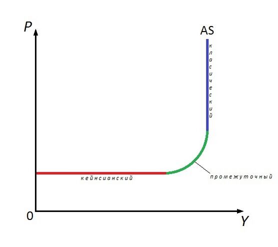 Кривая совокупного предложения (AS) показывает, какой объём совокупного выпуска может быть предложен производителями при разных значениях общего уровня цен. Выделяют три отрезка кривой (AS):