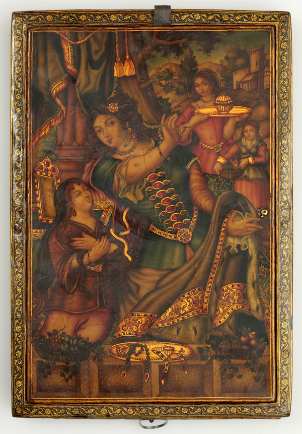 Лакированные предметы, которых насчитывается более 500, документируют эволюцию исламского лака с XV по XIX век. В них прослеживается влияние Китая в ранний период и Европы в XIX веке[60]. В коллекции представлены почти все известные художники-лакировщики исламского мира, а также некоторые ранее неизвестные. Среди известных художников — Мухаммад Заман и Мухаммад Садик[60]. Лакированная шкатулка для ручек Муина Мусаввира — единственная из известных его работ[61]. Шкатулка для ручек XIX века длиной 30 см была заказана Мохаммадом-шахом Каджаром для своего чиновника Манучехр-хана в память о битве последнего с бедуинами. На ней изображена битва с плотными сценами и описанием на персидском языке[62]. На футляре для инструментов XVIII века изображено Поклонение волхвов, а на другой стороне — женщина в героической позе[63].