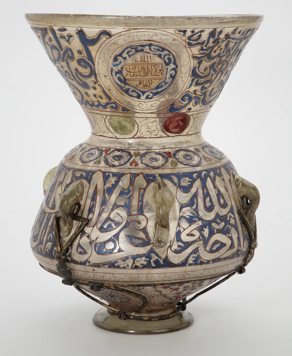 Более 300 предметов коллекции иллюстрируют историю исламского стекла, восходящую к Сасанидской и Византийской империям[70]. Египетские и сирийские стеклоделы XIII и XIV веков изготавливали богато украшенные эмалью и позолотой изделия из стекла, которые пользовались спросом на экспорт, и предметы коллекции относятся к этому периоду. Некоторые из них были заказаны мамлюкским двором для мечетей, и в коллекции есть один, созданный для султана Баркука XIV века[71], украшенный его геральдическим орнаментом[72]. Некоторые предметы выдуты в формах, и коллекция достаточно многочисленна, чтобы можно было сравнить несколько предметов из одних и тех же или похожих форм. Другие группы имеют резной или люстровый декор. Четыре полных предмета украшены редкой техникой царапаного стекла, что позволило провести новое исследование этой техники[70].