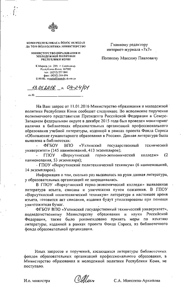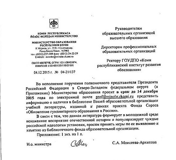 В ноябре 2015 года от полномочного представителя президента в Северо-Западном федеральном округе Андрея Травникова поступило поручение правительству Республики Коми, в котором говорилось, что Фонд Сороса реализовывал программы, «целью которых является популяризация среди молодёжи чуждых российской идеологии установок, формирования в молодёжной среде искажённого восприятия отечественной истории». В связи с этим предписывалось изъять из библиотек «учебные издания, не имеющие соответствующих рекомендаций Минобрнауки России и других уполномоченных государственных органов». В ответ на запрос интернет-журнала «7x7» и. о. министра образования и молодёжной политики республики Коми, сообщила, что во исполнение этого поручения из фондов библиотек была изъята и уничтожена литература, изданная в рамках проекта Фонда Сороса «Обновление гуманитарного образования в России». В Воркутинском горно-экономическом колледже литература была «уничтожена путём сожжения». И. о. министра также сообщила, что литература из другой библиотеки изъята и будет уничтожена, а третьему образовательному учреждению было рекомендовано также изъять литературу[32][33].