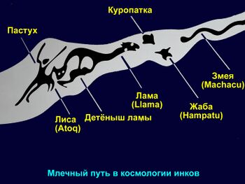 Главными объектами наблюдения в астрономии инков (что нашло отражение в их мифологии) были тёмные участки Млечного Пути — своеобразные «созвездия» в терминологии андских культур: Лама, Детёныш Ламы, Пастух, Кондор, Куропатка, Жаба, Змея, Лиса[21], а также другие объекты звёздного неба: Южный Крест, Плеяды, Лира и многие другие[22].