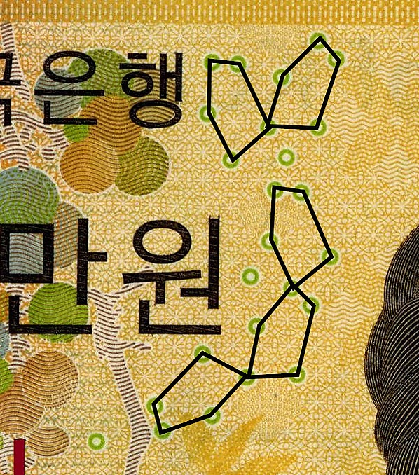 В Сети также приводятся некоторые результаты анализа геометрических параметров этого шаблона из колец Омрона на примере английского фунта стерлингов [1]. Из этого анализа, в частности, следует, что для опознания банкноты эти геометрические параметры (линейные размеры, степень размытости и т. п.) должны выдерживаться очень жёстко.