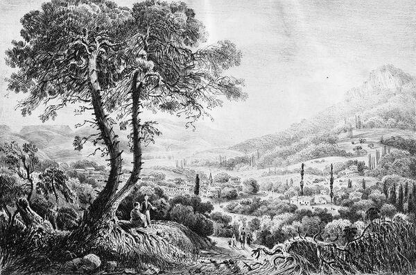 …через Яйлу до Кокоз, большой прекрасной деревни на берегу Кабарты… Татары Кокоза очень состоятельны, занимаясь торговлей лесом, спускаемым ими с ужасно крутых гор на вышеупомянутых санях; живут они в хороших чистых домах, имеют прекрасно устроенные сады, а владетель этой деревни, самой большой на всем полуострове, коллежский советник Меметша-бей, имеет здесь построенные в турецком вкусе трактир и гарем, а также хорошую мельницу[52].
