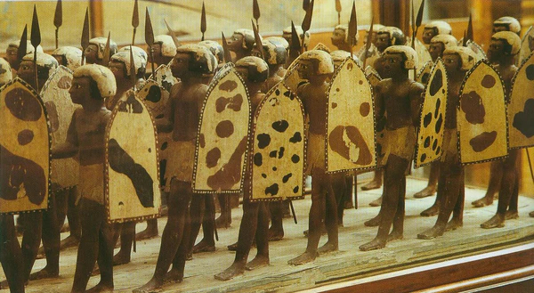 Древнейшие фигурки воинов-солдат появились в Древнем Египте во времена Среднего царства, около 2000 года до н. э. В эту эпоху распространяется обычай помещать в гробницы знати посвятительные фигурки ушебти, как правило, из раскрашенного дерева. Целых два набора таких ушебти в виде отрядов египетских воинов с копьями и щитами и нубийских лучников были обнаружены в гробнице Месехти, номарха Асьюта (Ликополя) (X династия, XX в. до н. э.)[1] и ныне находятся в экспозиции Каирского музея[2]. Примерно этим же временем датируются деревянные раскрашенные фигурки легковооружённого воина нубийской пехоты и египтянина в тяжелых доспехах, найденные в гробнице сына фараона Эмсаха[3].