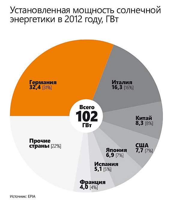 В 2012 году общая мощность мировых гелиоэнергетических установок выросла на 31 ГВт, превысив 100 ГВт.